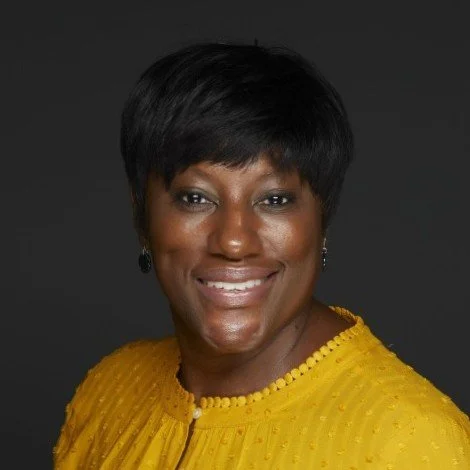 Close-up of a smiling woman with short black hair wearing a yellow blouse against a dark background.