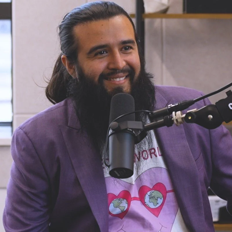A man with long dark hair and a beard, smiling, wearing a purple blazer and a white T-shirt with a graphic of two hearts containing the Earth, sitting in front of a microphone in an indoor setting.
